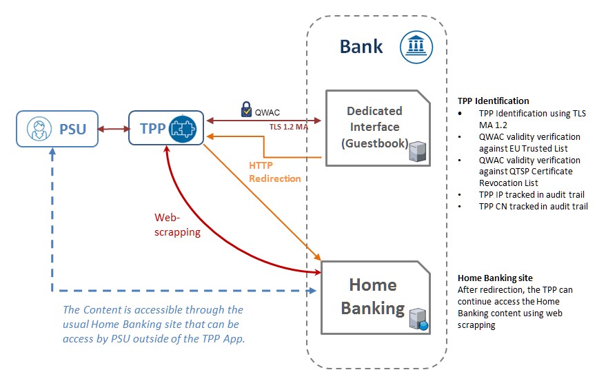 All these verification requests will be stored and tracked by the secured proxy service. Once all checks have been carried out and validated by the bank's verification service, the TPP will be redirected to the Home Banking site (using http 30X redirect) and will be able to perform "web-scrapping" on the html content as the TPP currently does.
